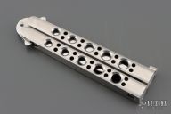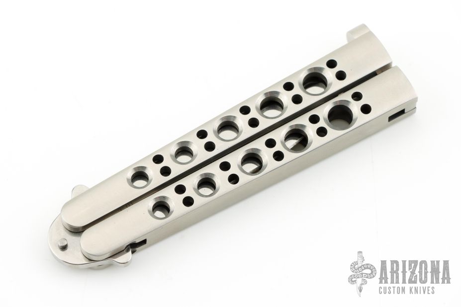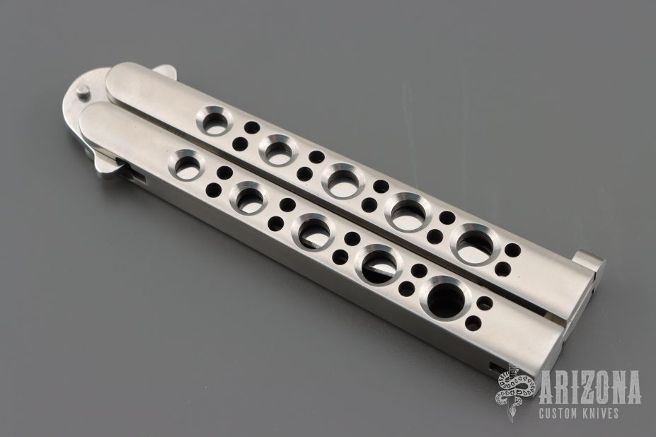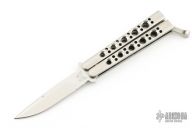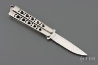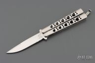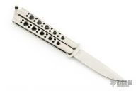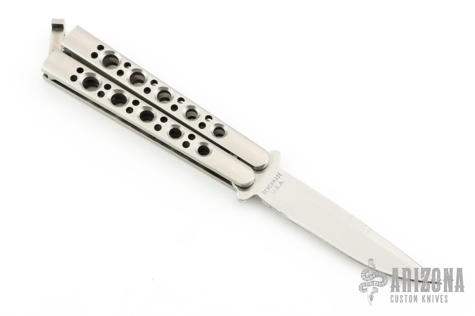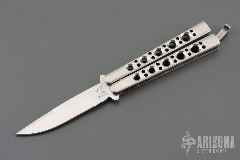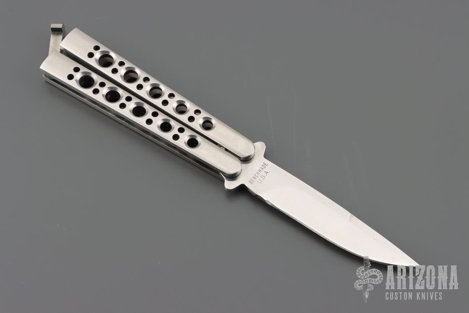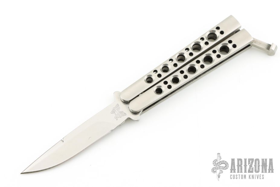 This vintage Model 35S Balisong from Benchmade features a polished drop point blade. The handle is comprised of integral steel construction. T latch on pommel. Comes with original box, papers, and nylon sheath. Has a couple light scratches, excellent condition otherwise.