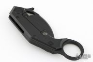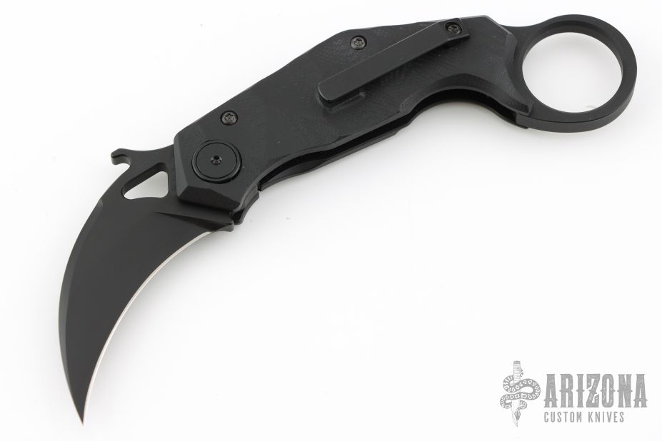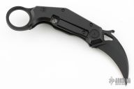 This Karambit by M3 Tactical Tech features a black blade with thumbhole and wave feature. The handle has a black G-10 and black titanium frame with matching backspacer and tip up clip. Nice detent, lockup and blade seating. Excellent condition.