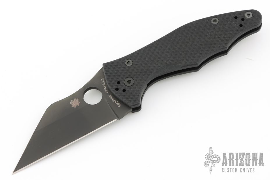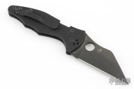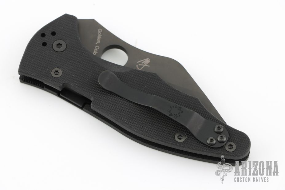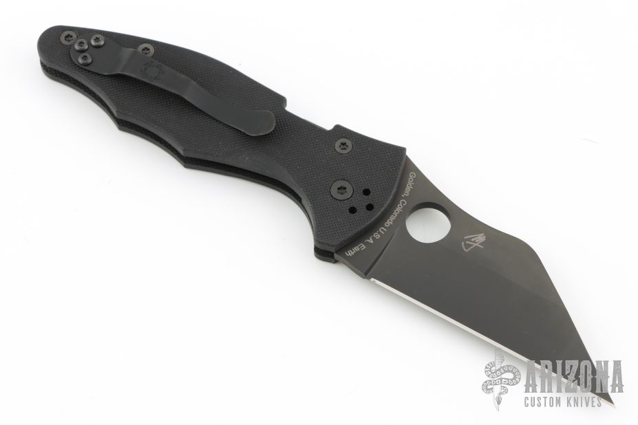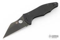 This Yojimbo 2 by Spyderco features a black finished wharncliffe blade with thumbhole. The handle has a black G-10 frame with stainless steel liners, lock is on the spine of handle. 4-way reversible black deep carry clip. Nice detent, lockup and blade seating. Has a couple light scuffs, otherwise excellent condition.