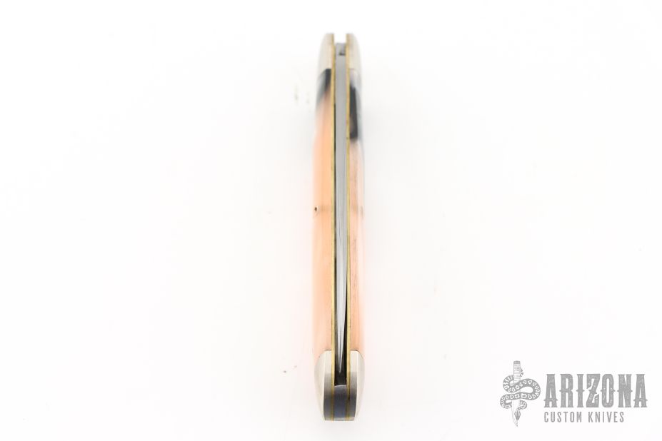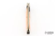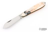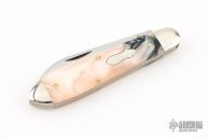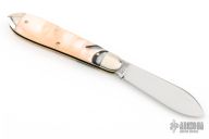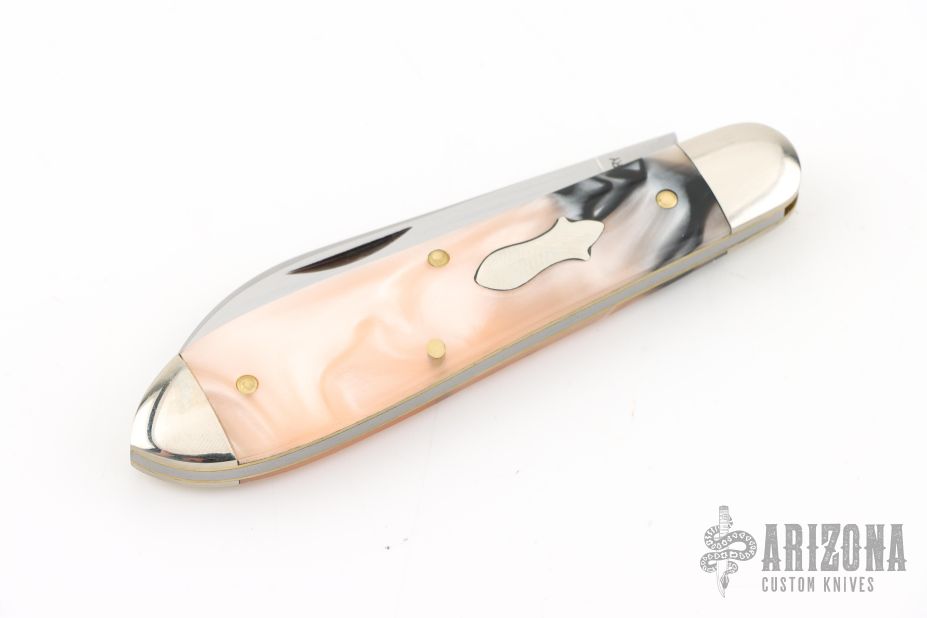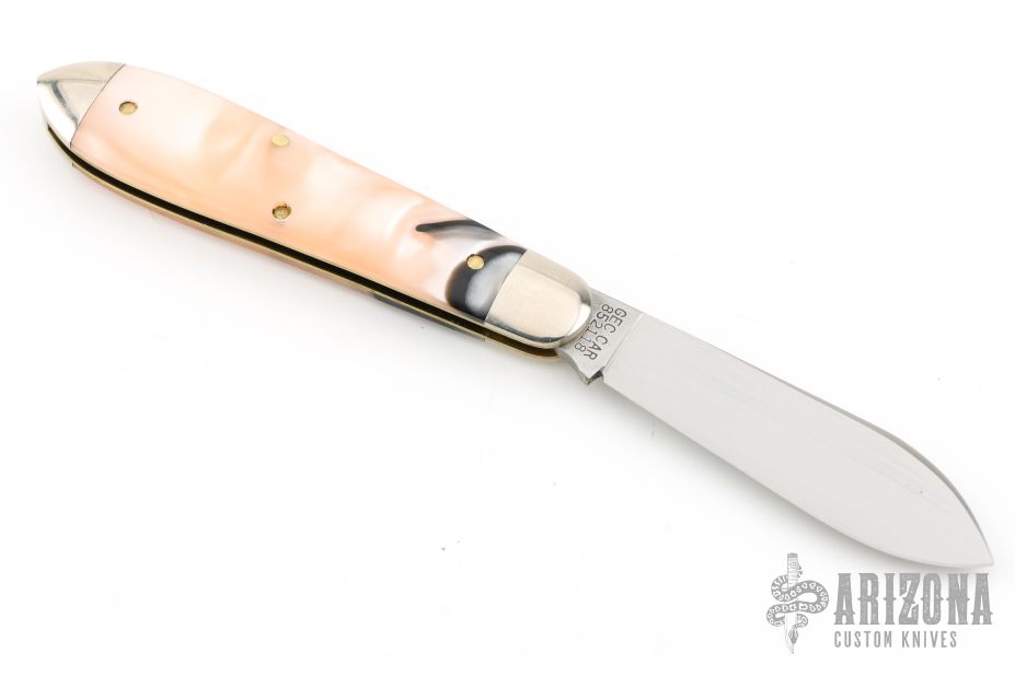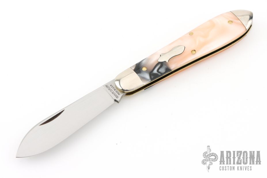 This slipjoint by Great Eastern Cutlery features a satin finished blade with nail nick. The handle has nickel silver bolsters and brass liners, pink synthetic covers. Comes with original tube and wax paper. Excellent condition.