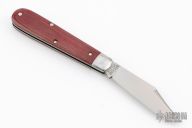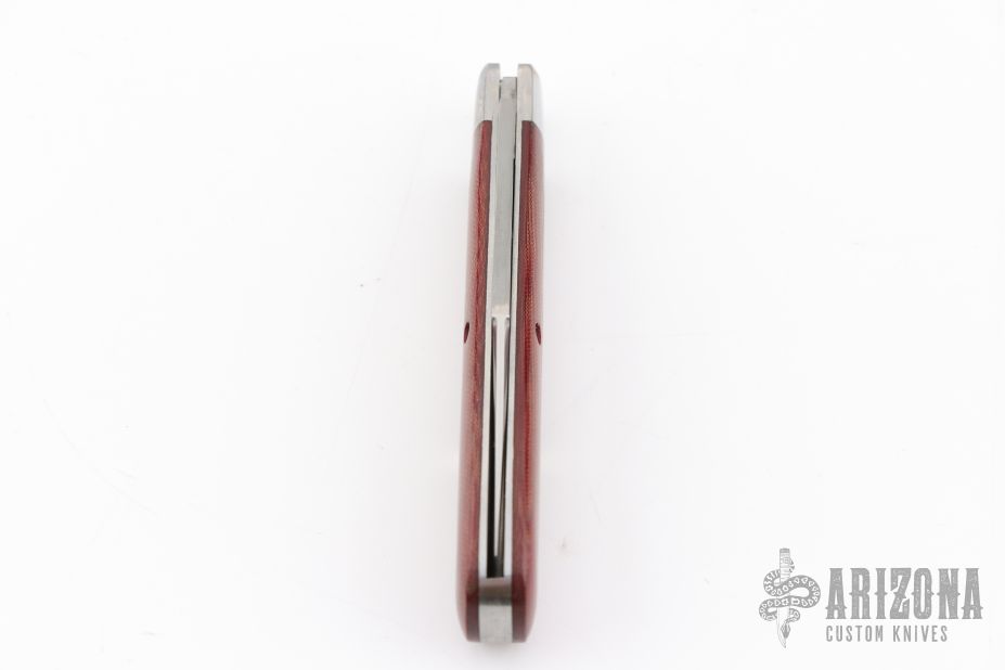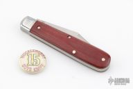 This slipjoint by Great Eastern Cutlery features a satin finished clip point blade with a single nail nick. The handle has stainless bolsters, red linen micarta covers, stainless steel liners and spring. Has half stop. Comes with original tube, button, and wax paper. Excellent condition. 243 made