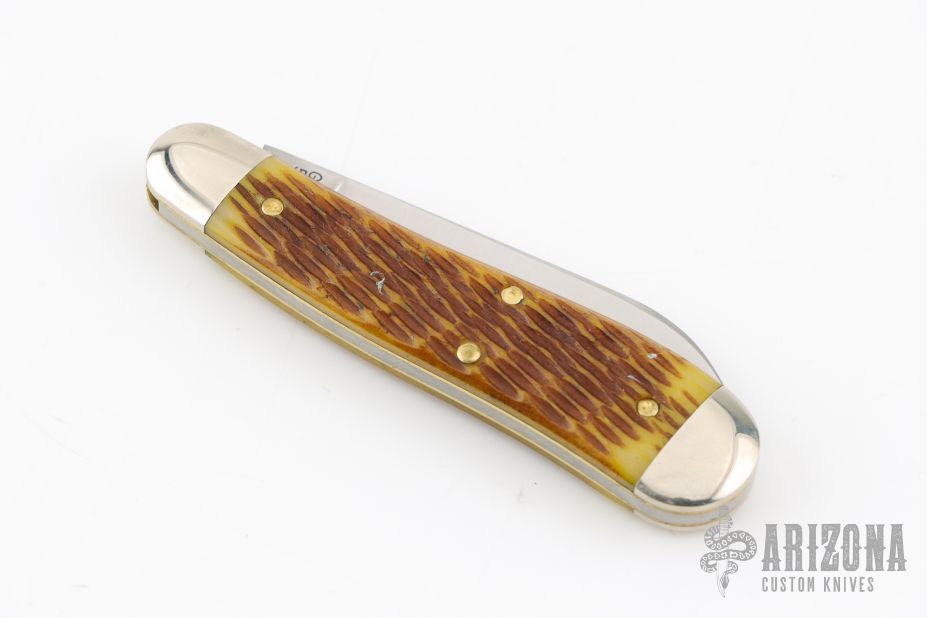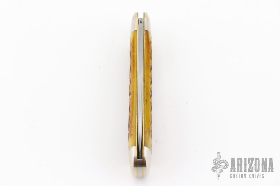 This Bird Dog Jack by Northfield Knives features a satin finished drop point blade with swedge and nail nick. The handle is comprised of pinched nickel silver bolsters front/rear, escutcheon, mustard jigged bone covers, over brass liners and stainless steel spring. Includes original tube and wax paper. Excellent condition.
