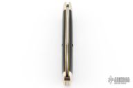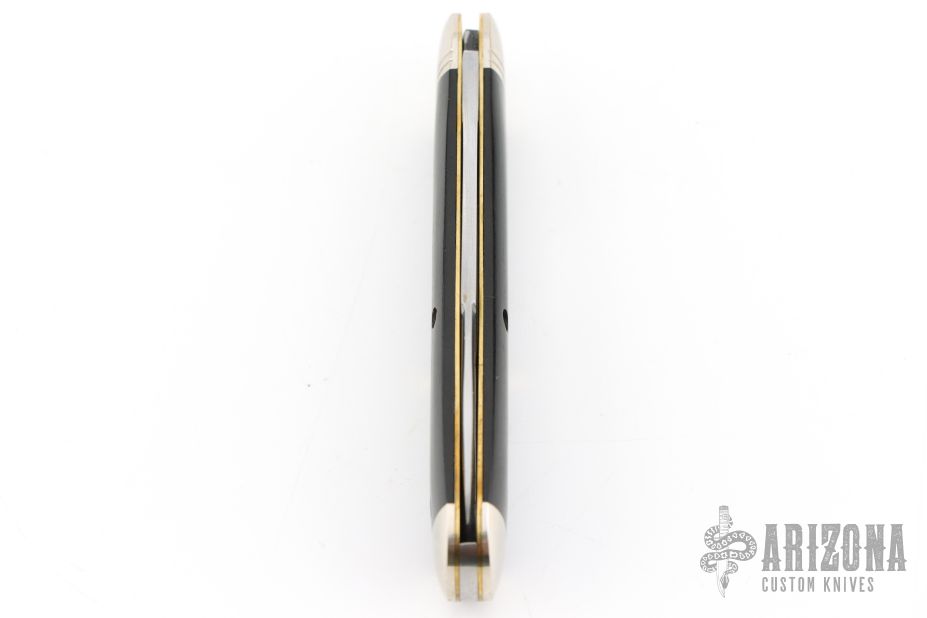 This American Jack by Great Eastern Cutlery features a satin finished blade with nick and swedge. The handle has nickel silver bolsters and butt, Gabon Ebony covers with brass liners, and a stainless steel spring. Has half-stop, flush in the open and closed positions. Comes with original tube and wax paper. Excellent condition.