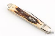 This knife by Great Eastern Cutlery features a polished clip point blade with long pull nail nick. The handle has pinched/threaded nickel silver bolsters, brass pins, brass liners, burnt stag covers. Has half-stop. Comes with original tube, COA, and wax paper. Excellent condition. #2/25.