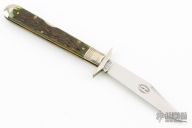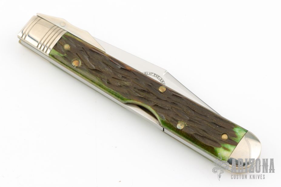 This knife by Great Eastern Cutlery features a polished clip point blade with long pull nail nick. The handle has pinched/threaded nickel silver bolsters, brass pins, brass liners, nickel silver swing guard, steel rockerbar, and relish jig bone covers. Comes with original tube, COA, and wax paper. Excellent condition. #14/35.