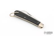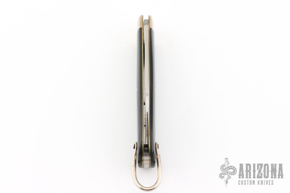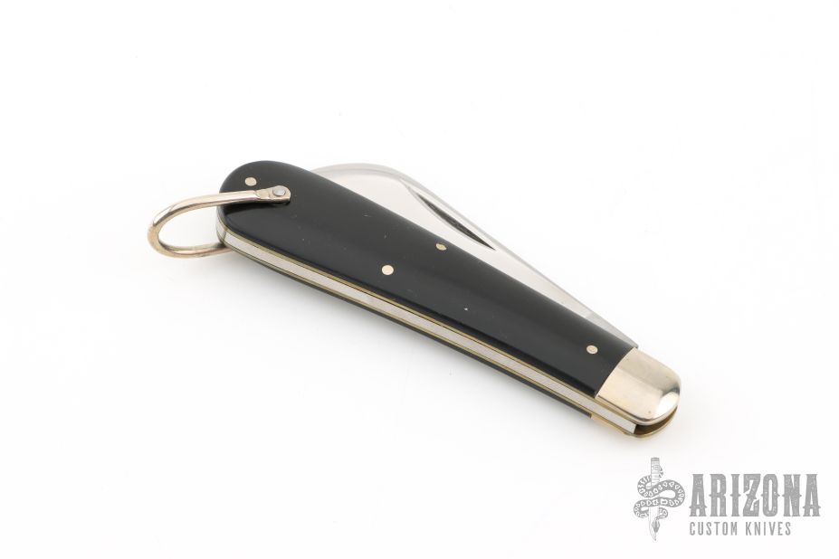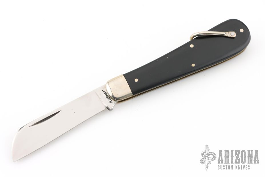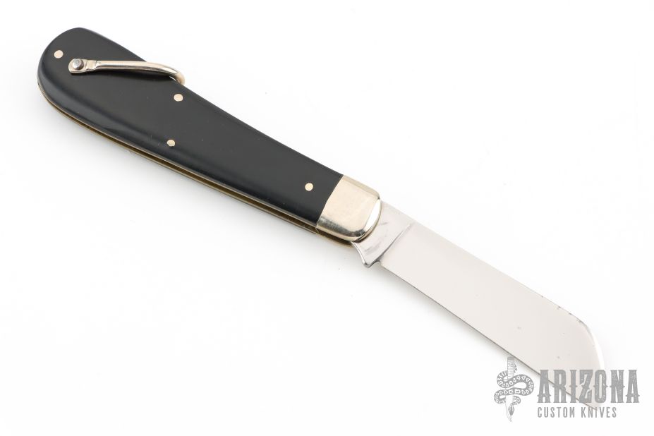 This slipjoint by Ka-Bar features a mirror polished wharncliffe blade with a single nail nick. The handle has nickel silver bolsters, black scales over brass liners and a steel spring. Coems with original box and papers. Has a couple light scratches, otherwise excellent condition.