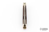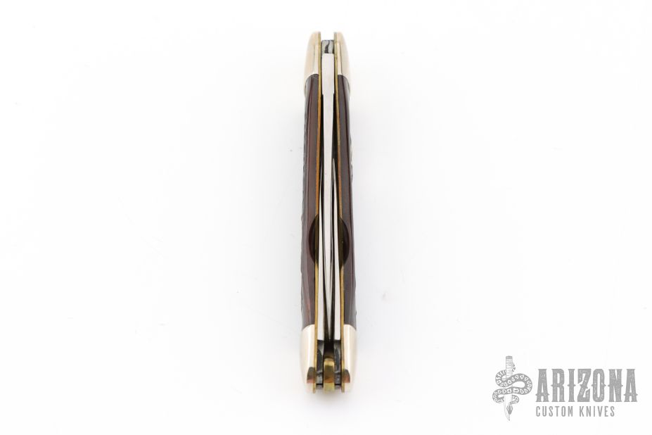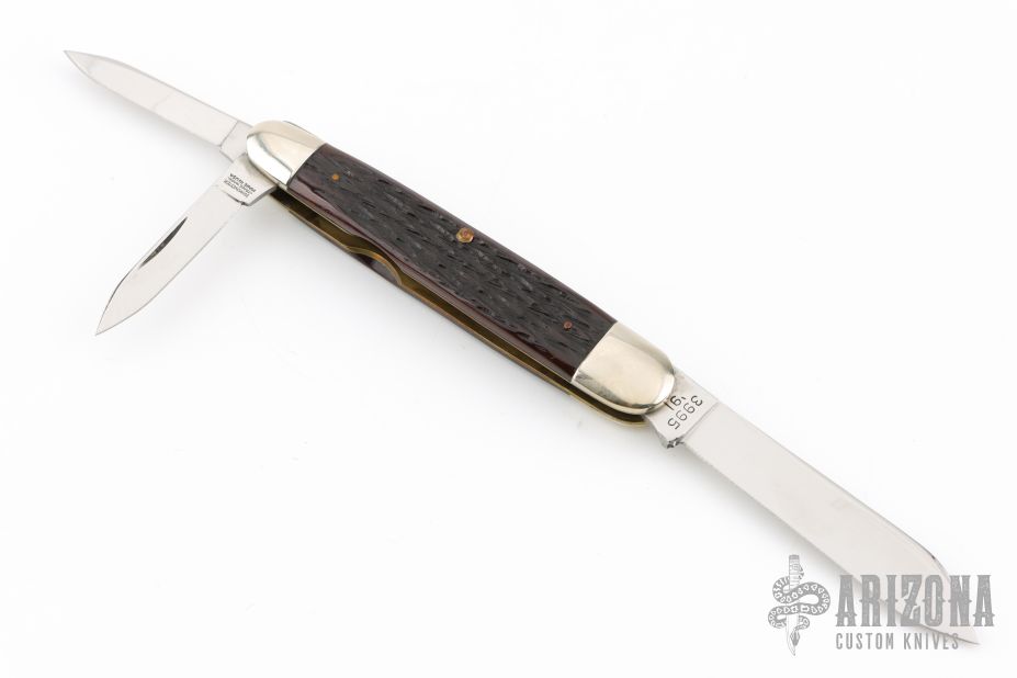 This Winchester folder features three mirror polished blades with nail nicks. Nickel Silver front and rear bolsters with jigged bone covers. Brass liners and steel springs. Original box. Excellent condition. Dated 1991