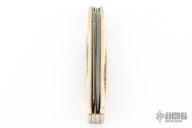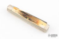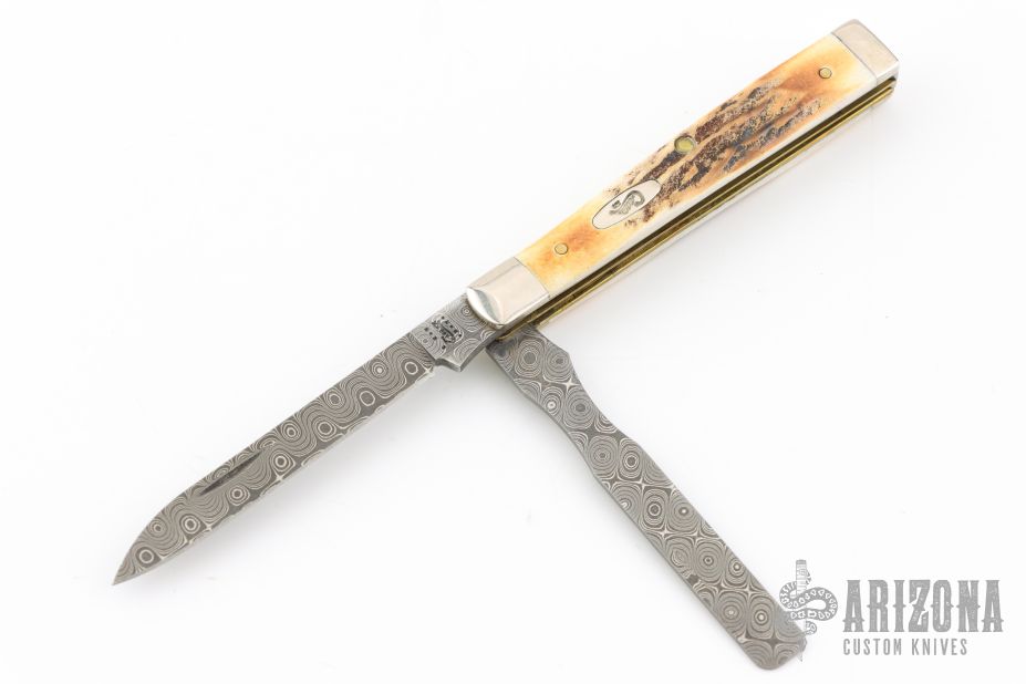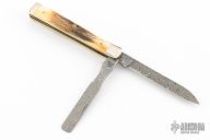 This Doctors Knife slip joint by Case Knives features a Damascus drop point blade with nail nick and a Damascus spatchula blade. The handle has nickel silver double bolsters, stag covers, brass liners and stainless spring. Comes with original box and papers. Excellent condition.