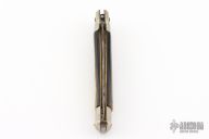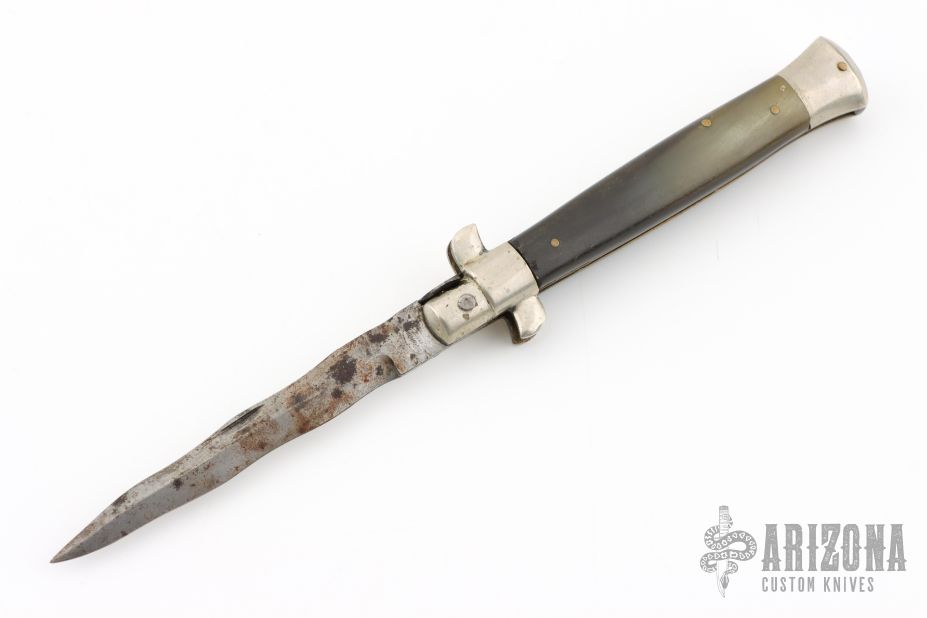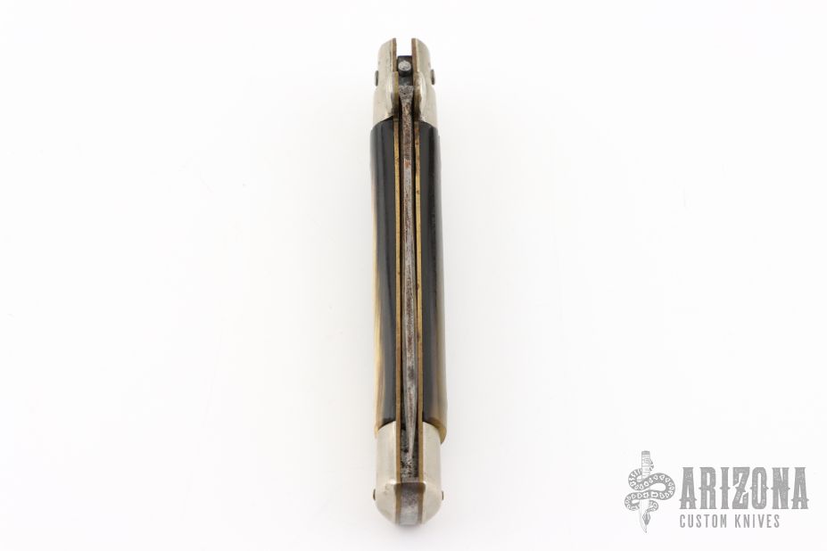 This Picklock slipjoint from EIG Italy features a satin finished Kris ground blade with false top edge and nail nick. The handle has nickel silver bolsters and pommel with buffalo horn scales over brass liners and steel backspacer. Has scuffs, scratches, pitting, rust, and has been re-sharpened. Fair condition.