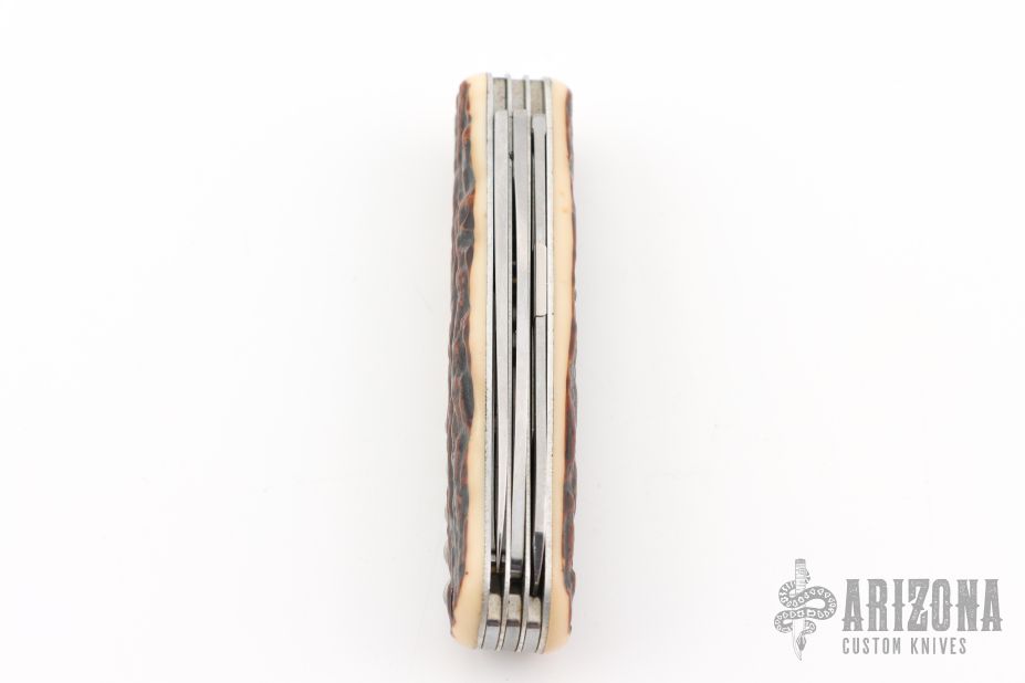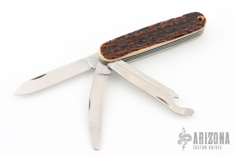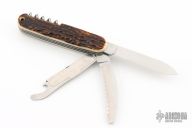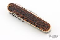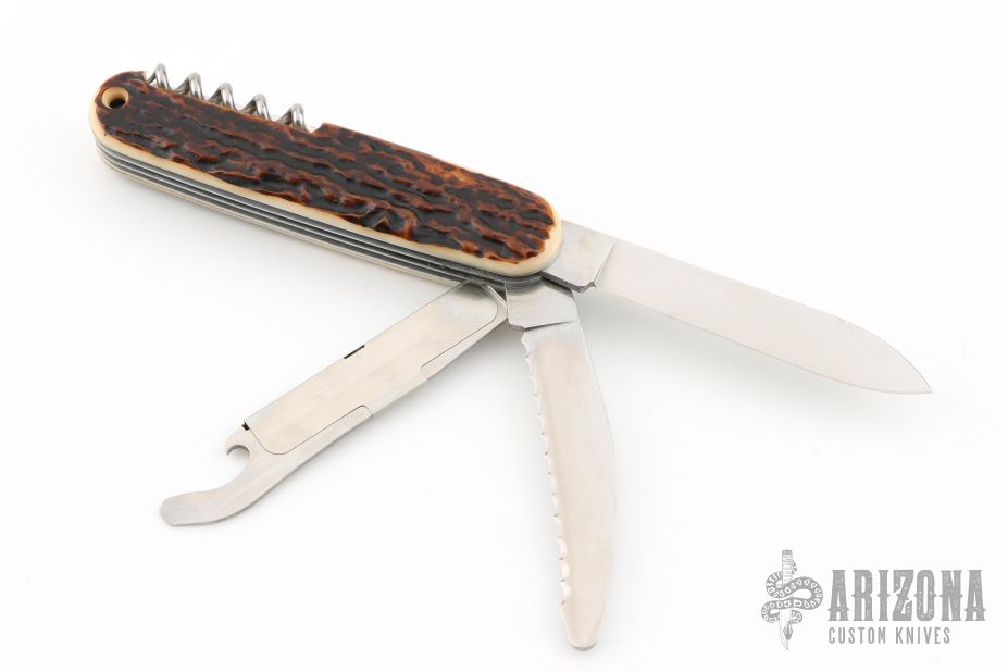 This knife from Victorinox features a polished spear point blade with nail nick. The knife also includes a wood saw, cork screw, second serrated blade, bottle opener, flat head screw driver and an awl. The handle has stag covers over stainless steel backsprings and aluminum liners. Lanyard hole. Comes in a Victorinos box. Excellent condition.