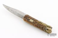 This Antique Folding Pig Sticker features a polished clip point blade with false top edge. The handle has folding nickel silver swing guard, stag scales, brass liners, steel backspacer with picklock style lock.  Has some scratches and patina, otherwise good condition for an old antique knife.