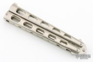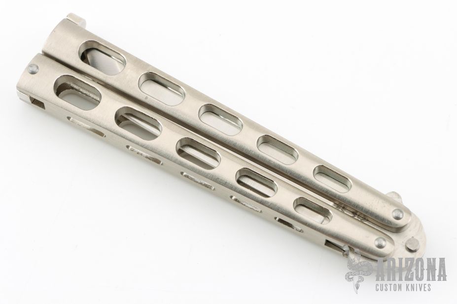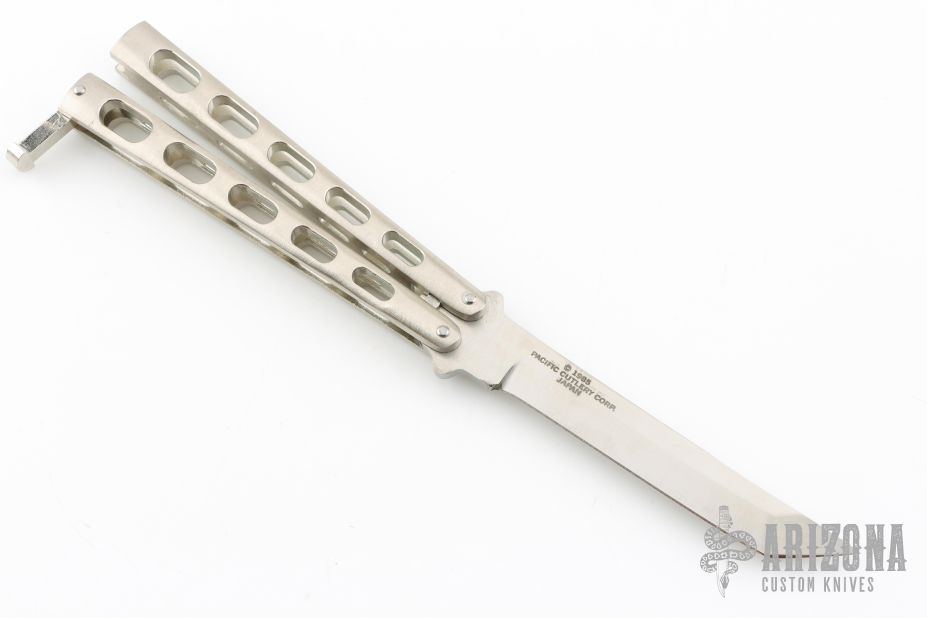 This International Series Tanto Balisong has a satin finished stainless steel blade (marked 1985). Handle is skeletonized aluminum. Solid lock up both open and closed. Comes with original box. Has some light scratches, excellent condition otherwise.