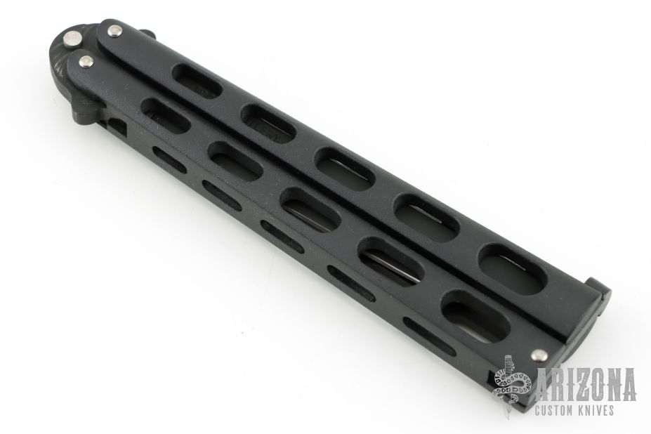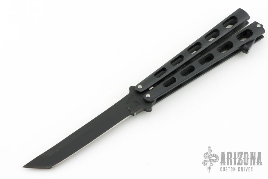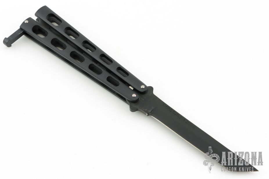 This Model 148 International Series from Pacific Cutlery features a black coated upswept tanto blade. Blade says "Pacific Cutlery, Japan". The handle has black coated handles. This knife is from the mid-80's, hard to find, excellent condition for its age. Great piece of balisong history. Comes with original box. Has some light scuffs, otherwise excellent condition.