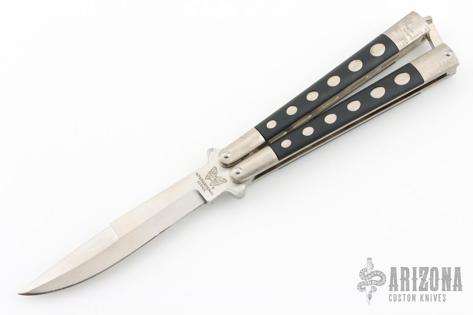 This Balisong by Benchmade features a satin finished spear point recurve blade. The handles are zanak with black plastic inlays. Has some light scratches, and discoloration. Great condition otherwise.