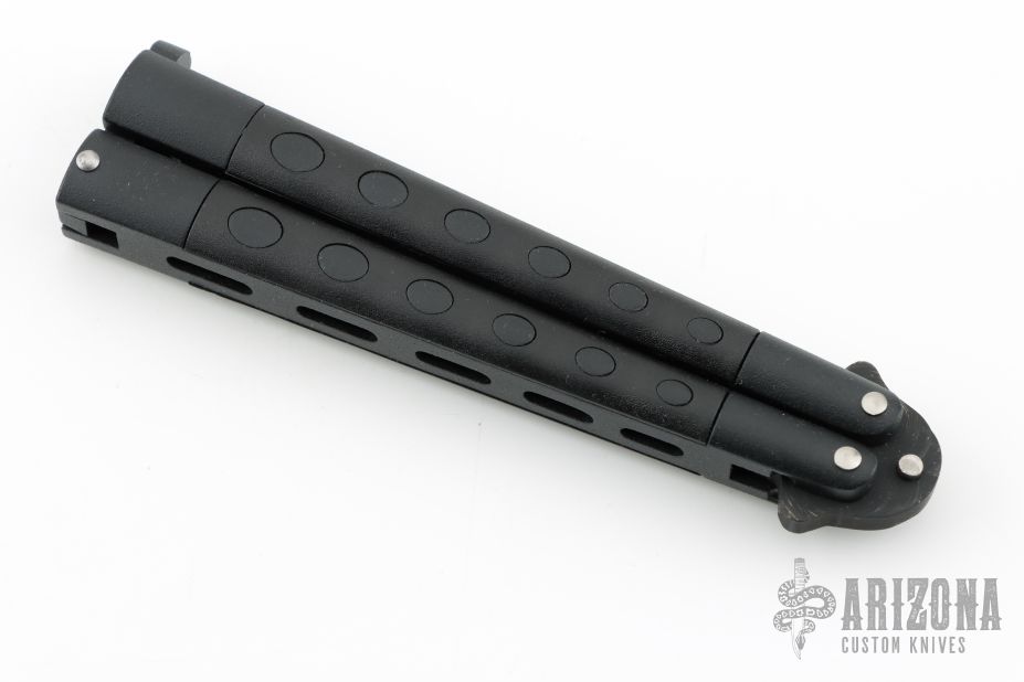 This International Series Balisong has a black finished stainless steel blade with false top edge. Handle is black steel with black plastic inlays. Solid lock up both open and closed. Comes with original box. Has a couple light scratches, excellent condition.