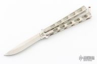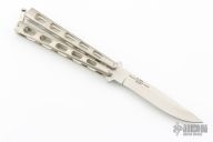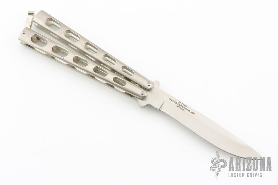 This Model 190 International Series from Pacific Cutlery features a satin finished recurve drop point blade. Blade says "1985 Pacific Cutlery Corp. Japan". The handle has chrome slotted handles. This knife is from the mid-80's, hard to find, excellent condition for its age. Great piece of balisong history. Comes with original box. Has some light scuffs, otherwise excellent condition.