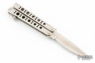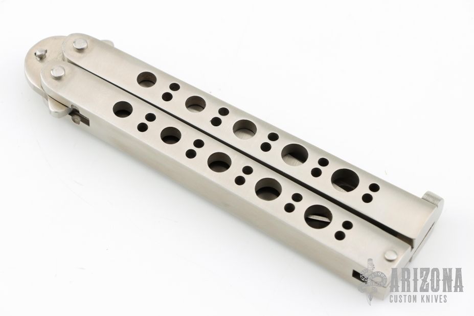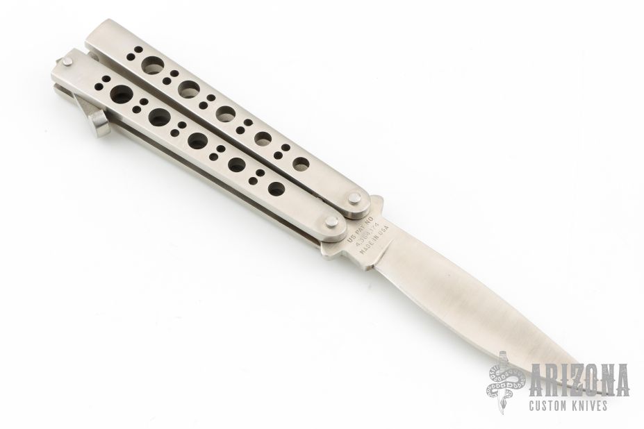 This Model 10 Bali-song by Pacific Cutlery features a satin finished drop point blade. The handle is comprised of a skeletonized, integrally constructed steel frame with T latch on pommel. Comes with original box, and nylon belt sheath. Has a couple light scratches, excellent condition.