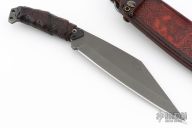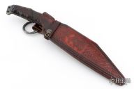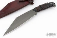 The RMJ Tactical Combat Valhalla features an 8.75" forward-weighted Seax blade with the signature Celtic wolf eye milled into the steel. .235" Blade Stock. 2.228" Blade Depth. It has a heavily contoured g10 handle with an aftermarket alligator skin wrap for enhanced grip. The knife comes with a two-tone leather sheath from Chattanooga Leatherworks, featuring an embossed Celtic wolf and knot design, a forged ring baldric, and a leather loop for belt carry. Excellent Condition.