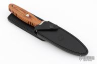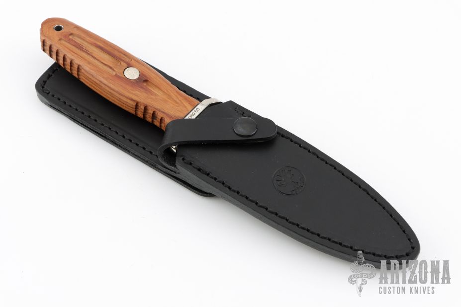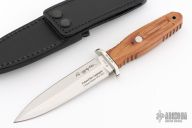 This Applegate-Fairbairn Boot Dagger by Boker Knives has a satin polish finished double edged spear point blade with .179" blade stock, 1.282" depth. The handle is comprised of a matching steel guard with black fiber spacer with Rosewood handle over hidden tang construction. Lanyard hole in pommel. Includes original box, papers, and leather sheath with belt loop. Numbered 084/199 on guard. Excellent condition.