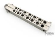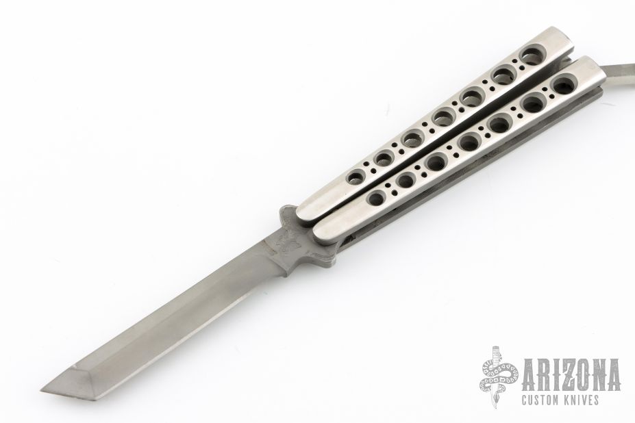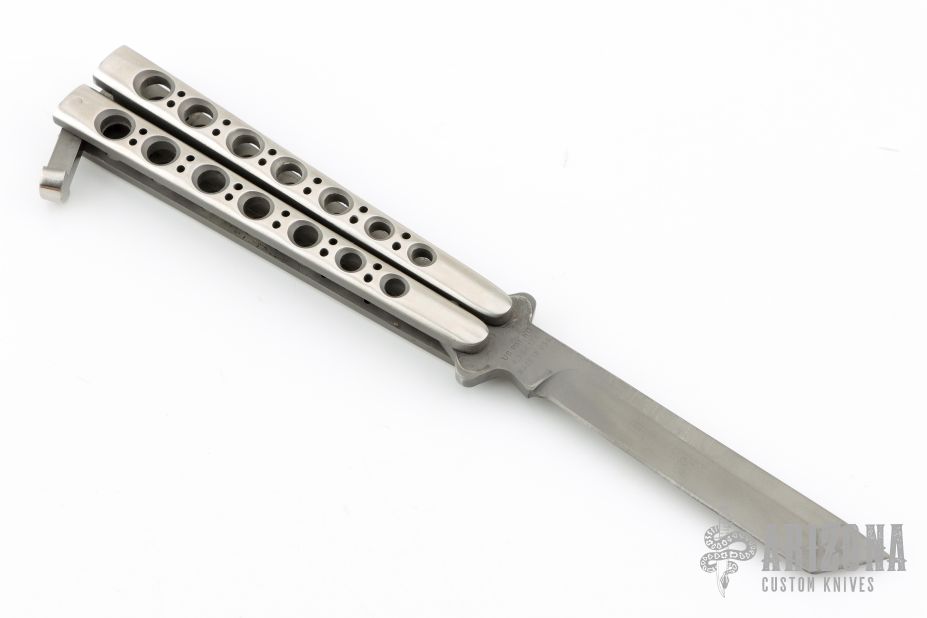 This early balisong from Pacific Cutlery features a Jody Samson ground bead blast finished tanto style blade. The handles are stainless steel with hole pattern and two-tone polish/matte finish. Comes with original box. Has some light scuffs, and scratches. Excellent condition otherwise.