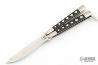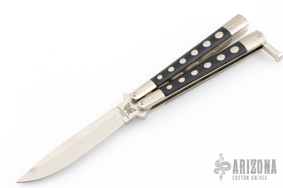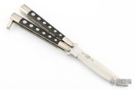 This International Series Utility Balisong has a satin finished stainless steel blade (marked 1985). Handle is steel with black plastic inlays. Comes with original box. Excellent condition.