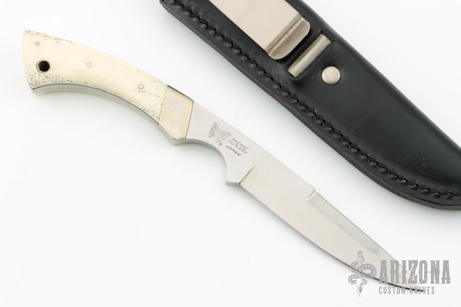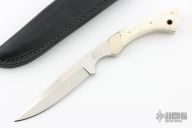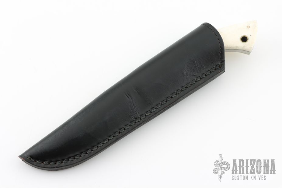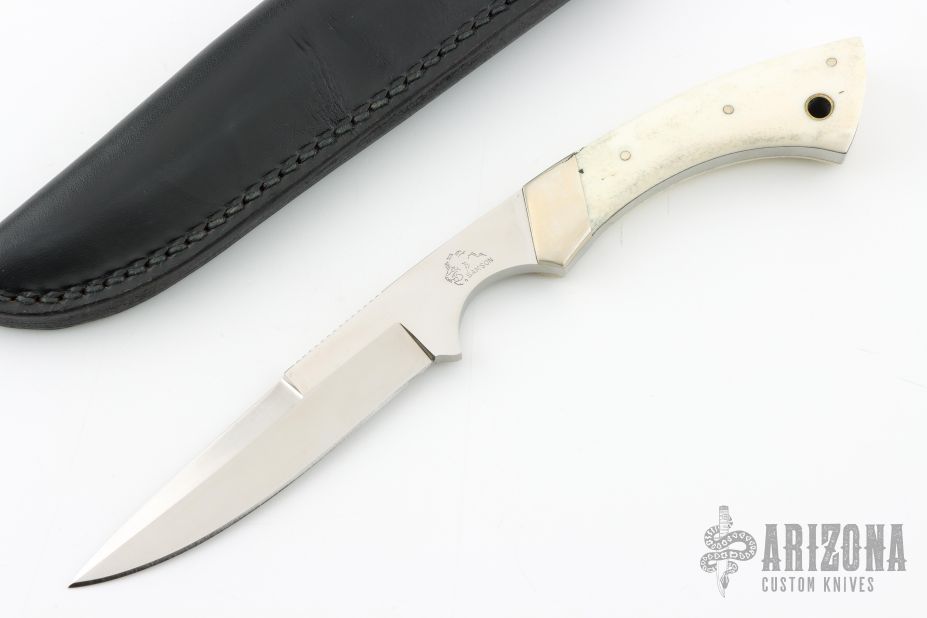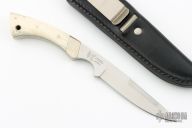 This Weehawk Boot Knife by Pacific Cutlery features a satin finished blade with a false top edge and notched thumbrest, .174" blade thickness and .767" blade depth, full tang construction. The handle has nickel silver bolsters and bone scales with nickel silver pins. Great feel in the hand. Classic Samson design. Comes with a black leather sheath with clip. Has some oxidation and the scales have shrunk slightly. Excellent condition otherwise.