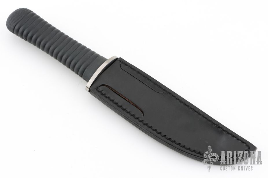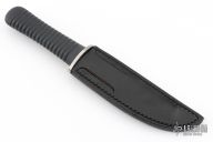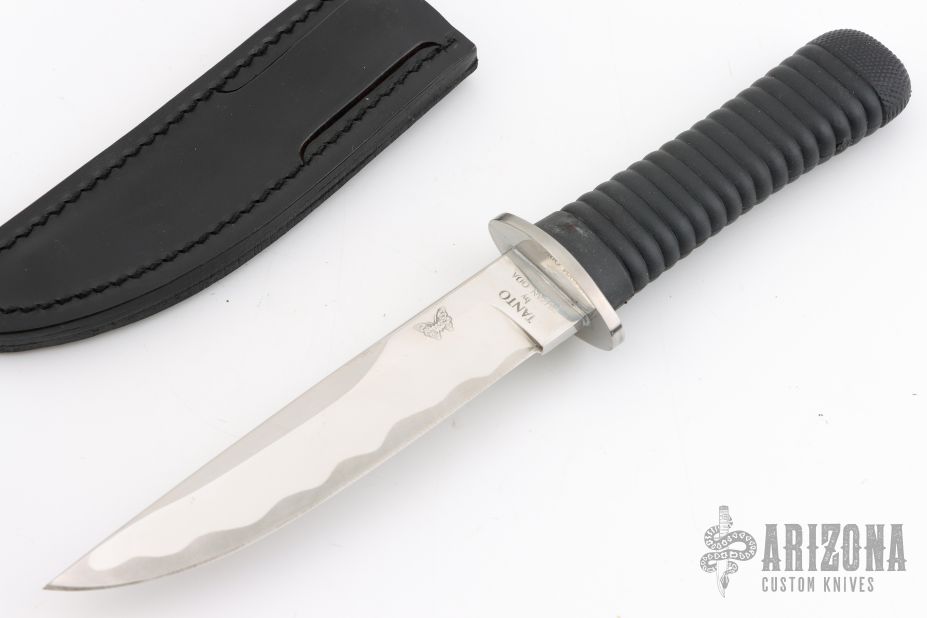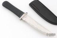This Tanto by Kuzan Oda was produced by Pacific Cutlery in Japan. It has a mirror finished blade with a simulated hamon, .171" blade stock and 1.186" blade depth, hidden tang construction with a black rubber handle. Comes with a black leather sheath. Has a few scuffs/scratches otherwise the knife is in excellent condition.