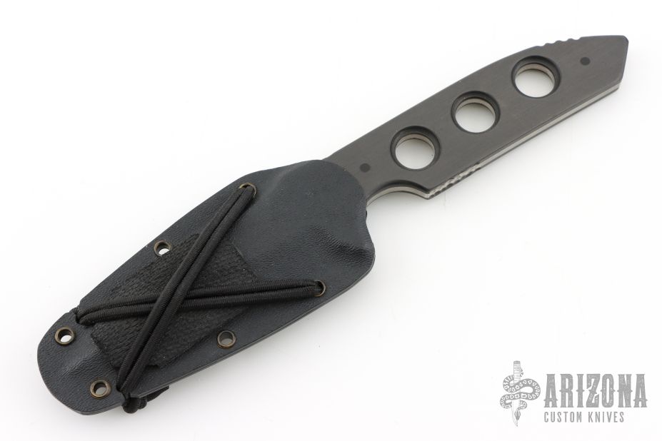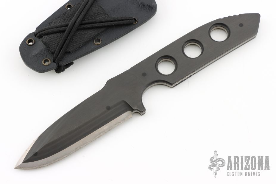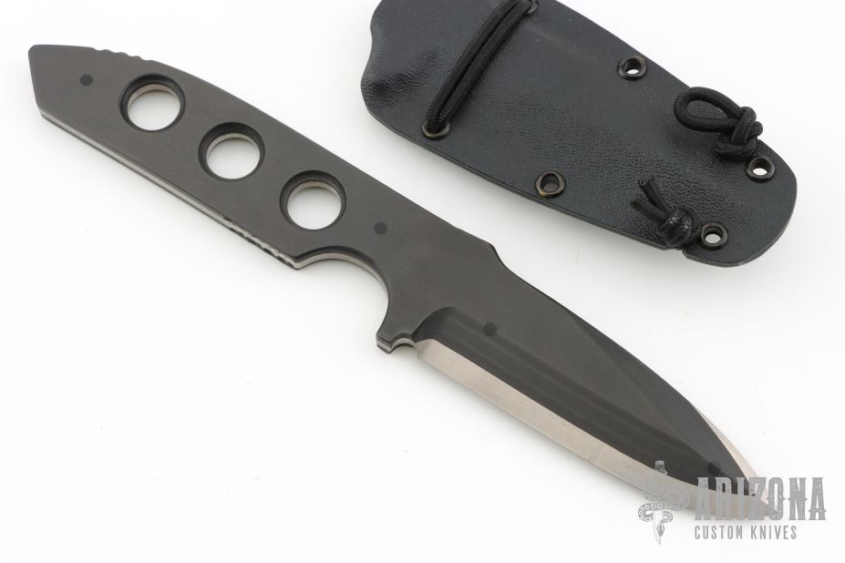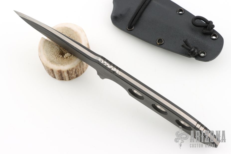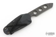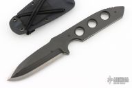 This TAD Dauntless fixed blade (please let us know if you know who made this) features a satin finished titanium blade with carbidized edge, laminated by unidirectional carbon fiber, textured thumbrest, .314" blade stock and 1.307" blade depth, full tang construction. Comes with a kydex sheath. Has a few light sheath scratches, otherwise excellent condition. The consignor said he got it from the 6th USN show. This knife has no markings.