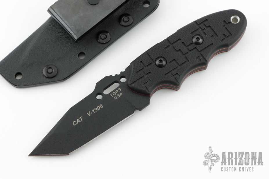 This Cat by Tops knives features a black coated blade with notched thumbramp, .167" blade stock and 1.368" blade depth, full tang construction. The handle has black G-10 scales with red liners. Comes with a kydex sheath. Excellent condition. Comes with papers.