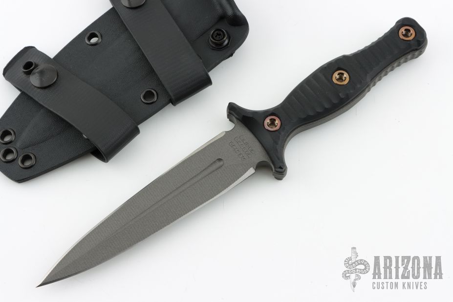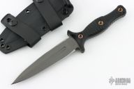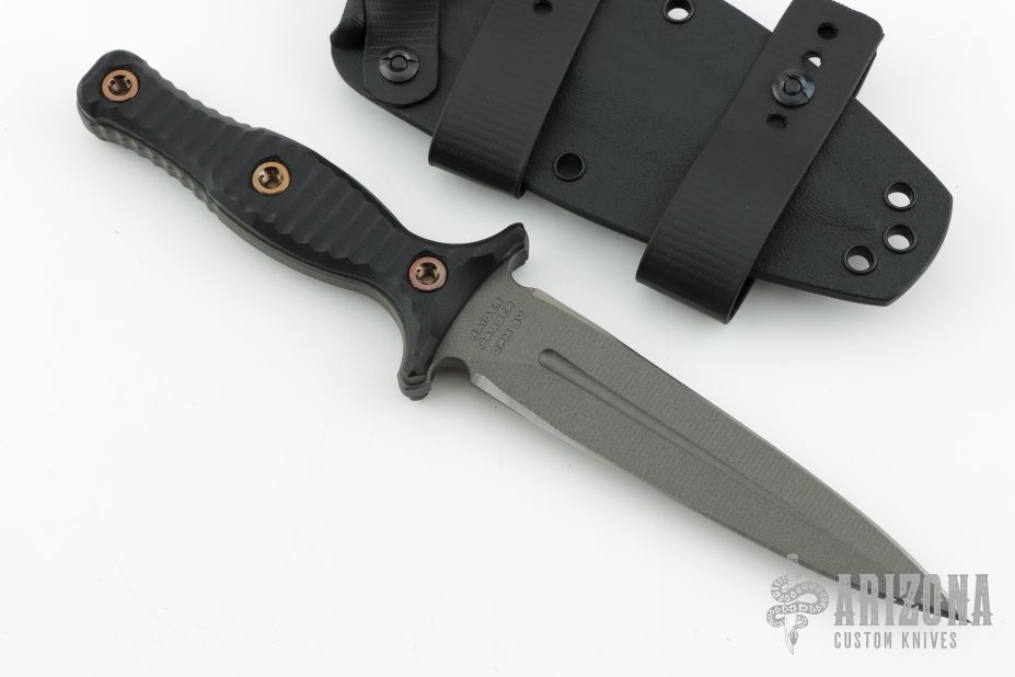 This Raider Dagger by RMJ Tactical features a sniper grey cerakoted double edged blade with fullers, .215" blade stock and 1.152" blade depth, full tang construction. The handle has black G-10 scales with anodized titanium screws, notched on tang of blade. Comes with a kydex sheath with belt loops. Comes with original box and papers. Excellent Condition.