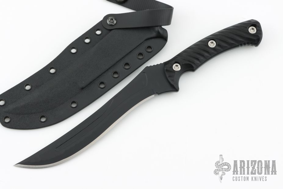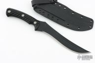The Wyrm is the final piece in this set representing the Tanto. It has a 7.25" blade with an overall length of 12", made from super tough CPM-3V steel. The blade will take ridiculous amounts of abuse, and is perfect for all your hard outdoor-use needs. The Wyrm has a hand-textured finish, then it is wrapped up in a Black Cerakote finish for corrosion resistance and durability and offers a low visibility look. The 3D contoured black G10 handle scales features a diagonal texturing for an aggressive but comfortable and secure grip. The handles are attached with Grade 5 titanium fasteners.