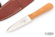 This sleeve dagger by TM Enos features a double edged satin/polish finished blade with .138" blade stock and .953" blade depth, full tang construction. The handle has pinned red/yellow laminate covers. Comes with felt arm sheath. Marked 1977. Has a couple light scratches, excellent condition otherwise.