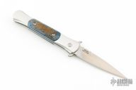 This Don features a satin blade, silver aluminum handle, and dyed giraffe bone inlays. Mother-of-Pearl inlaid push button. Excellent Condition.
