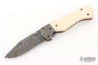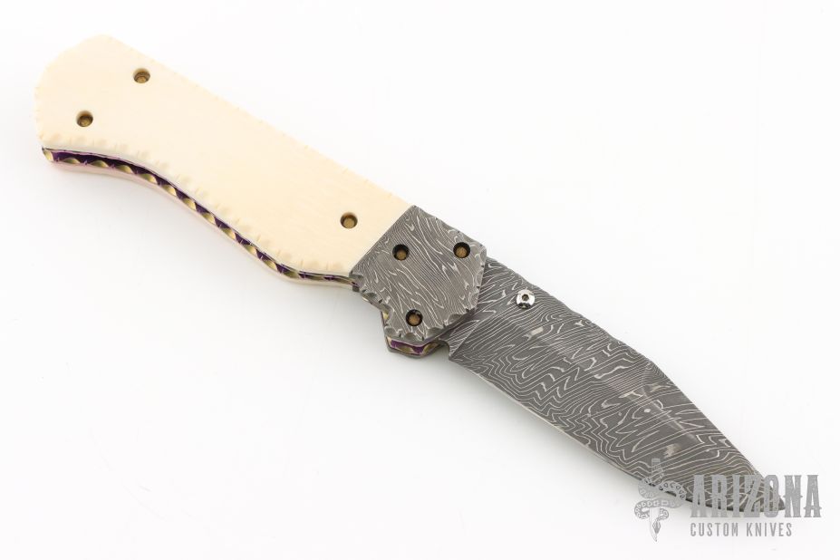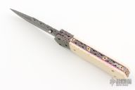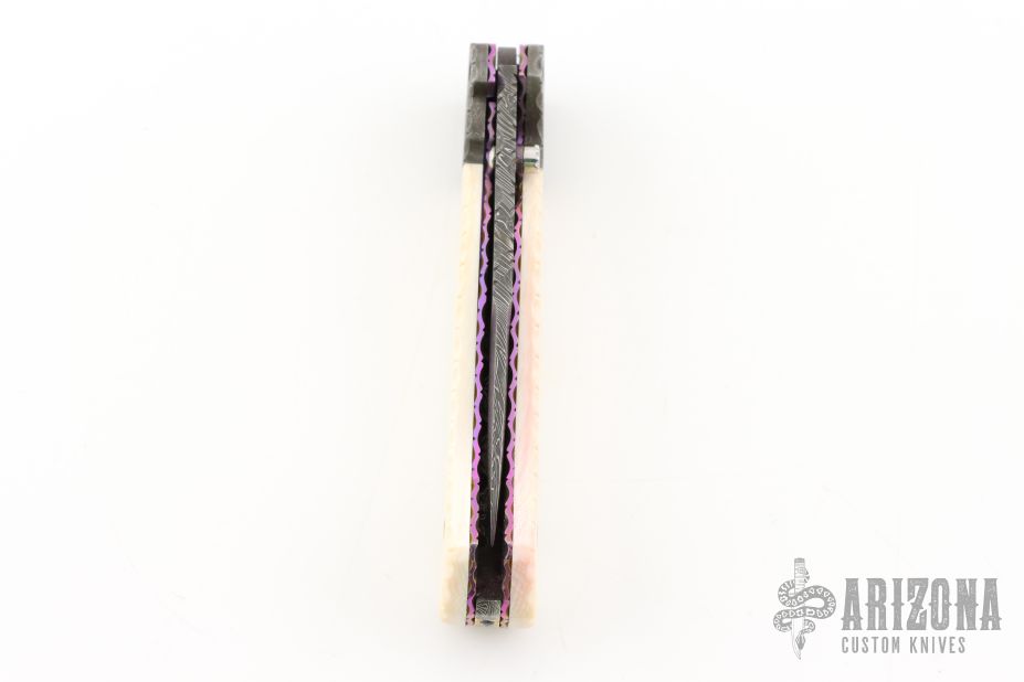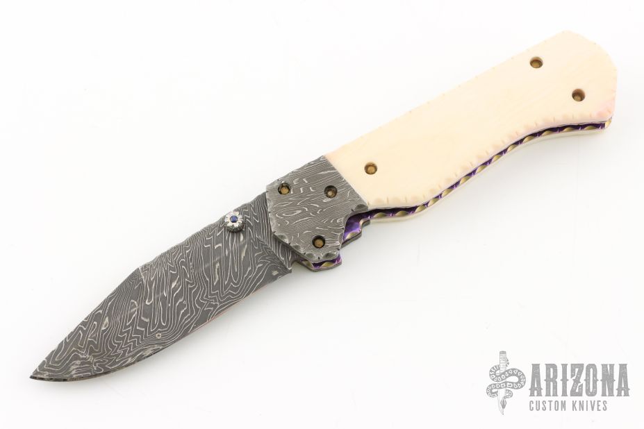 This linerlocking folder features a Damascus blade with a single thumbstud with a sapphire inset, false top edge and fileworked spine. The handle has fileworked Damascus bolsters, anodized and fileworked titanium liners, and a fileworked Damascus backspacer with 24kt gold inlays that have sapphire inlays. Nice detent, lockup and blade seating. Excellent condition. Comes with a zippered case. This knife is not marked, please let us know if you know who made it.