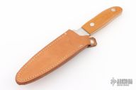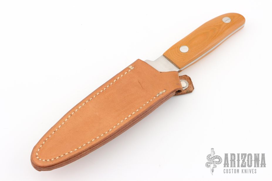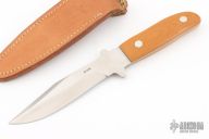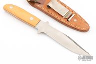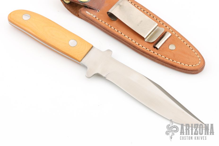 This fighter by GW Stone features a satin finished clip point blade with top edge, .136" blade stock, 1.020" blade depth, and full tang construction. The handle has pinned vintage paper micarta scales.  Comes with a leather boot sheath. Has some very light scratches, otherwise excellent condition. Requested and custom built for the consignor in 1977 by the maker.