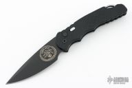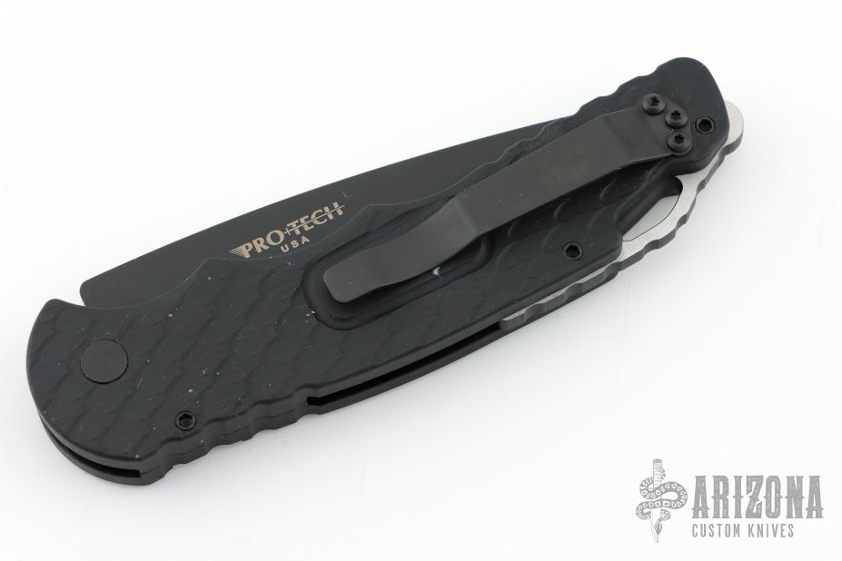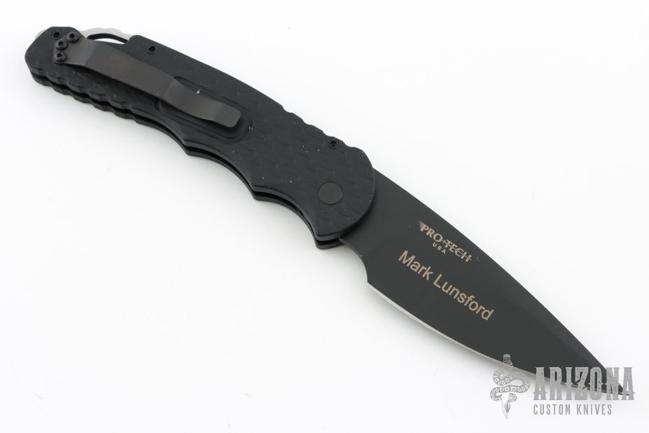 This Tactical Response TR-4 by Pro-Tech features a black anodized aluminum body, which provides good traction and looks great. The blade is black finished stainless steel with a plain cutting edge. The TR-4.3 is a knife that won't let you down. It fires hard, locks up like a rock, and feels great in hand. The slim design sits comfortably for tip-up pocket carry. Tritium is inset into the firing button, adding a unique and awesome flare to the piece. Comes with original box, nylon sheath and papers. Excellent condition. Has "Mark Lunsford" on the blade.