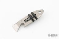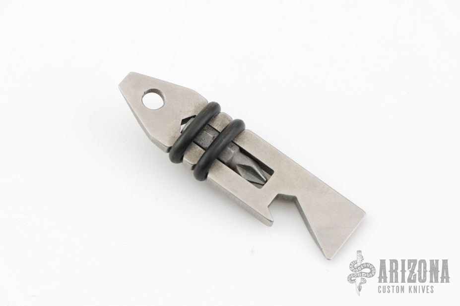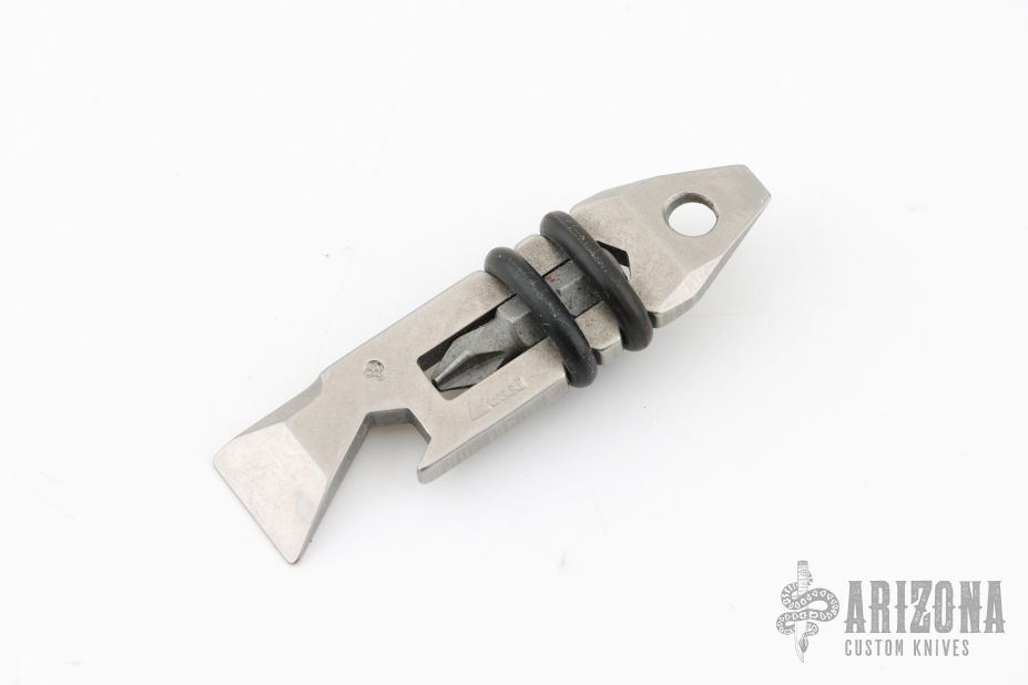 Atwood mini Superbug tools are made of knife steel, titanium or other exotic materials. Features include broad pry tip, cap lifter, 5/16 wrench, small prytip, and 1/4 inch captive bit system. A tint key ring tool with tons of functionality.  Excellent condition with original bag and card.