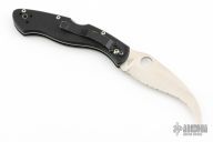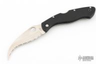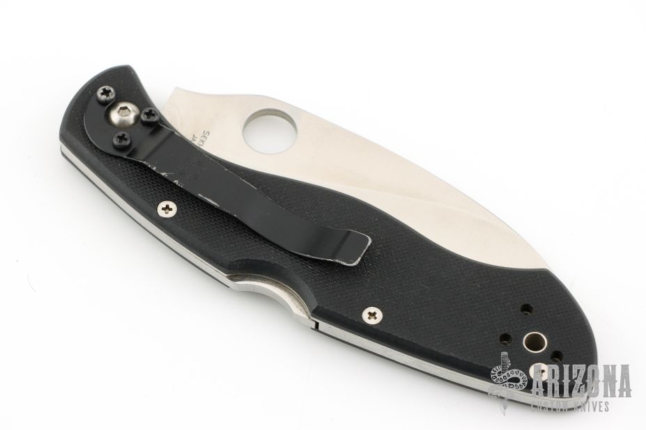 This Civilian Lockback Folder by Spyderco has a satin finished, fully serrated hawkbill blade with thumb hole. Handle is black G-10 with stainless steel (single) liner, stainless steel backspacer/ lock, and tip up/ down 2-way reversible RH black stainless steel clip. Comes with original zippered case and papers. The tip of the blade is missing.  The pocket clip has scratches on it otherwise the knife is in Excellent condition.