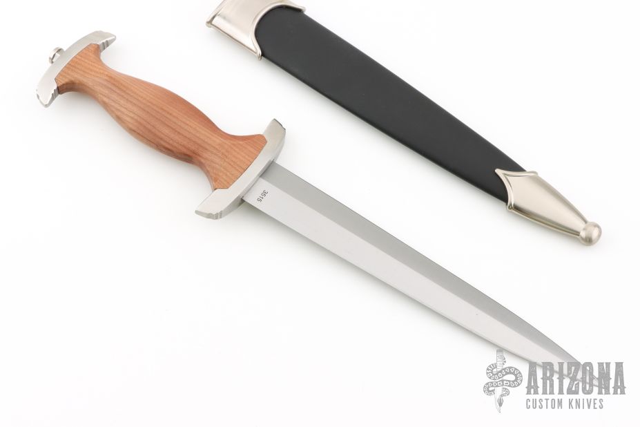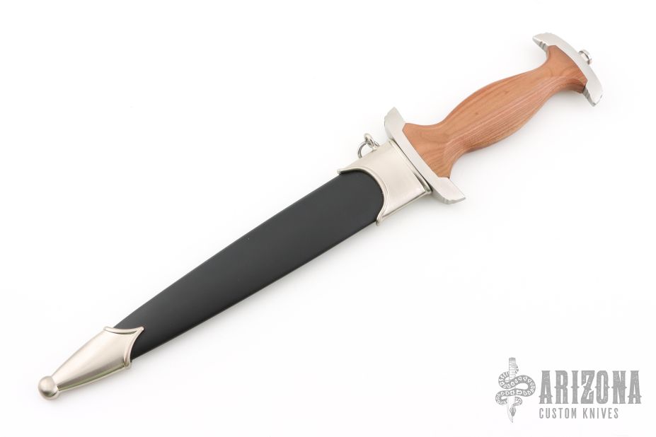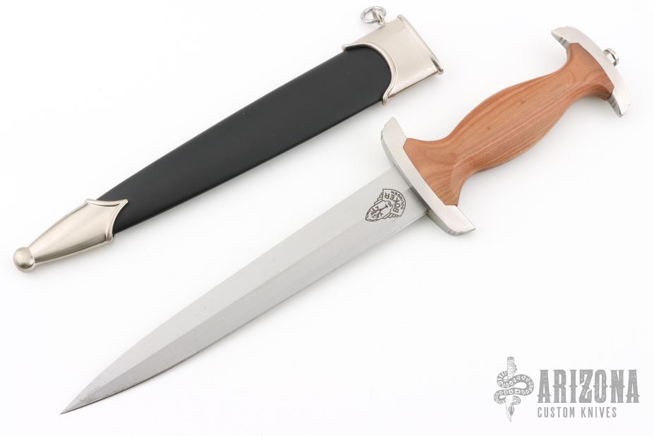 This dagger features a satin finished double edged blade, 3/16" blade stock and 1 1/4" blade depth, hidden tang construction. The handle has stainless steel guard and butt cap, cherry wood handle. Comes with metal scabbard and original box and papers. Has a couple of light spots on the blade near the tip, otherwise excellent condition. #3515.