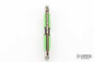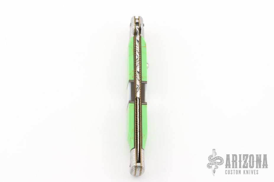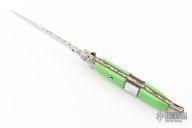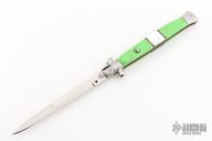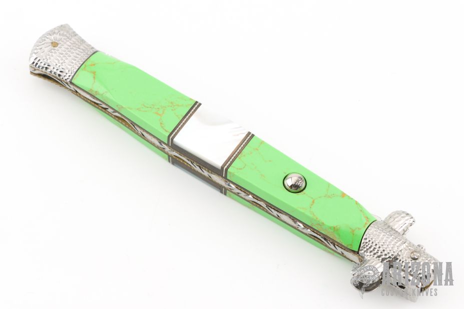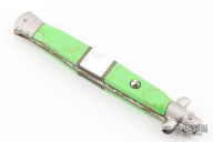 This is large picklock automatic with a 6" stainless blade with fileworked spine. Stainless steel bolsters with stippling. File work on backspring and brass liners. The scales are a green stone with mother of pearl inlay's in the middle. Great looking and thick (over 1/4") scales.  Marked "PROTO" on blade.  Has a few light scratches on the blade otherwise the knife is in excellent condition.