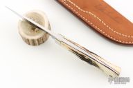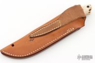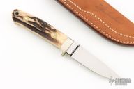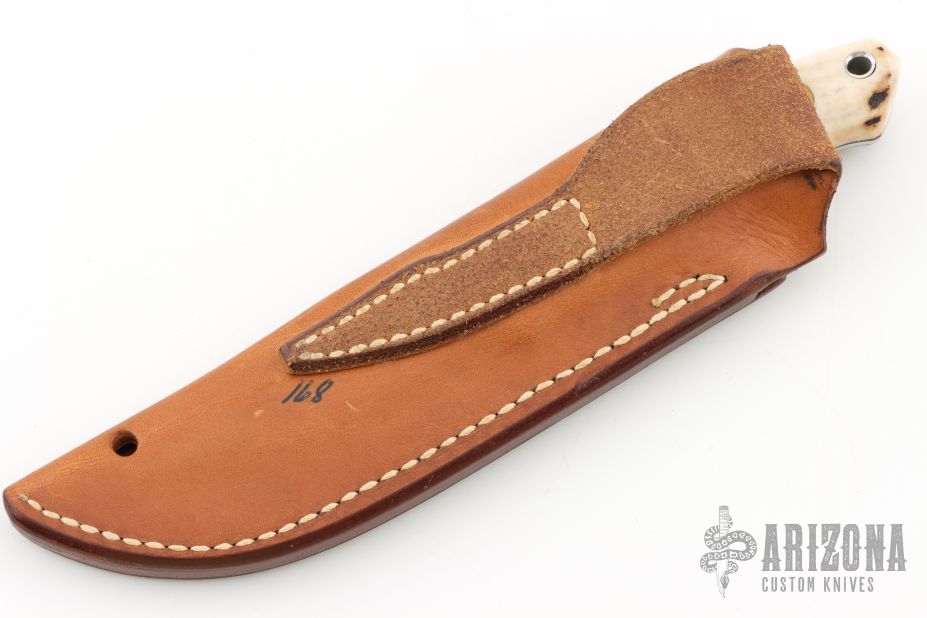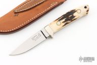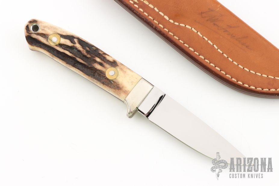 The Drop Point by Bob Loveless features a mirror finished drop point blade with the "R.W. Loveless maker" Riverside, California Nude logo. Full tapered tang construction. .190" Blade Stock .841" Blade Depth. The handle has a nickel silver guard and stag scales with red liners, lanyard hole. #168. Excellent condition. Really nice stag on this one! Comes with a brown leather sheath with matching number.