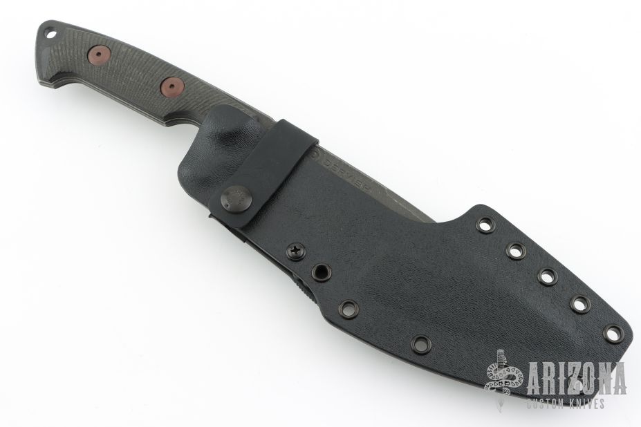The Ursa Minor from Dervish Knives is a TAD Gear Edition, it features a dark stonewash finished recurve drop point made from 3V steel, .188" blade stock and 1.882" blade depth, full tang construction. The handle has carbon fiber scales. Lanyard hole on back of handle. Includes Kydex sheath with TekLok. Excellent condition. Comes with COA dated 8-2016