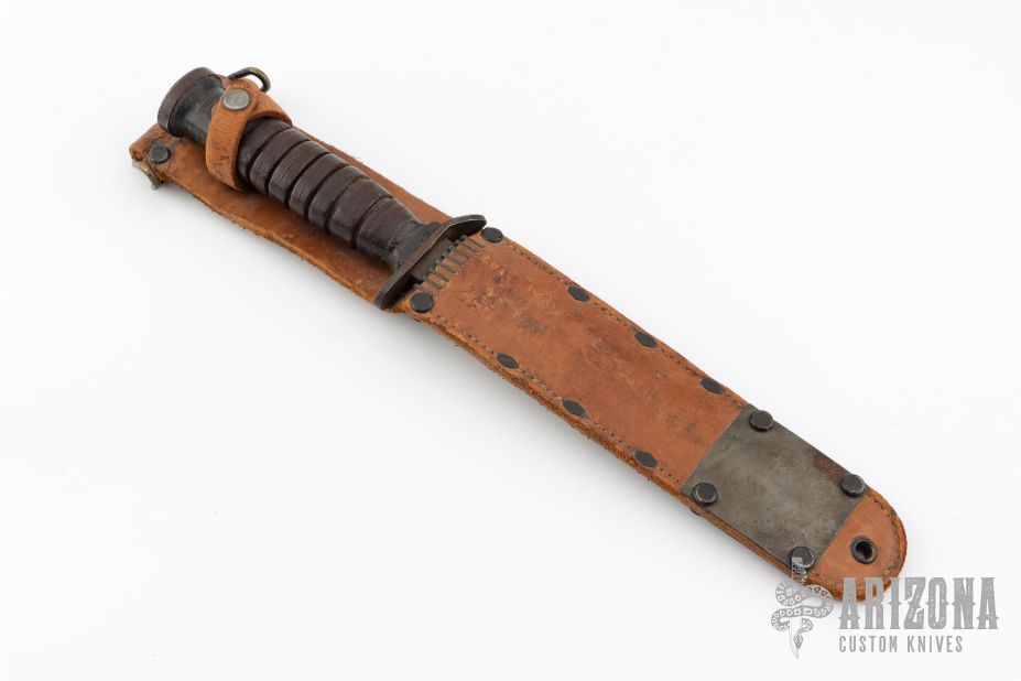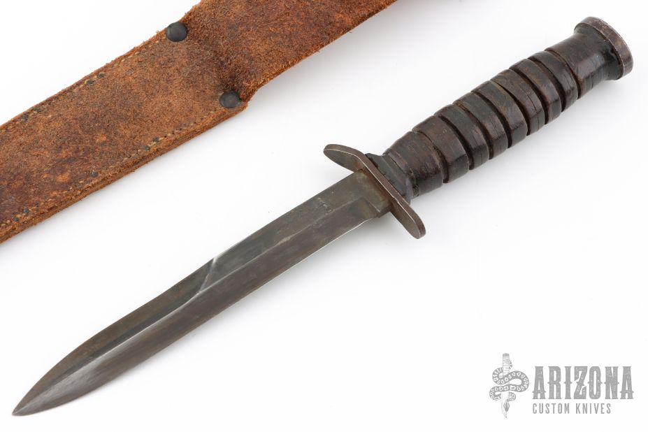 This M3 from Kinfolks Knives features a bayonet ground blade with sharpened top edge, .186" blade stock and .852" blade depth, hidden tang construction. The handle has a black guard and butt, and a stacked leather grip. Comes with a M6 MILSCO leather and metal scabbard with belt loop. Has scuffs, scratches, patina, and has been resharpened. Fair condition, good condition for its age.