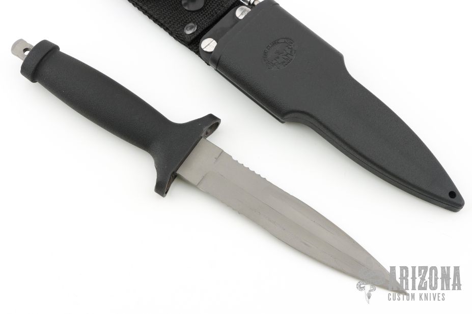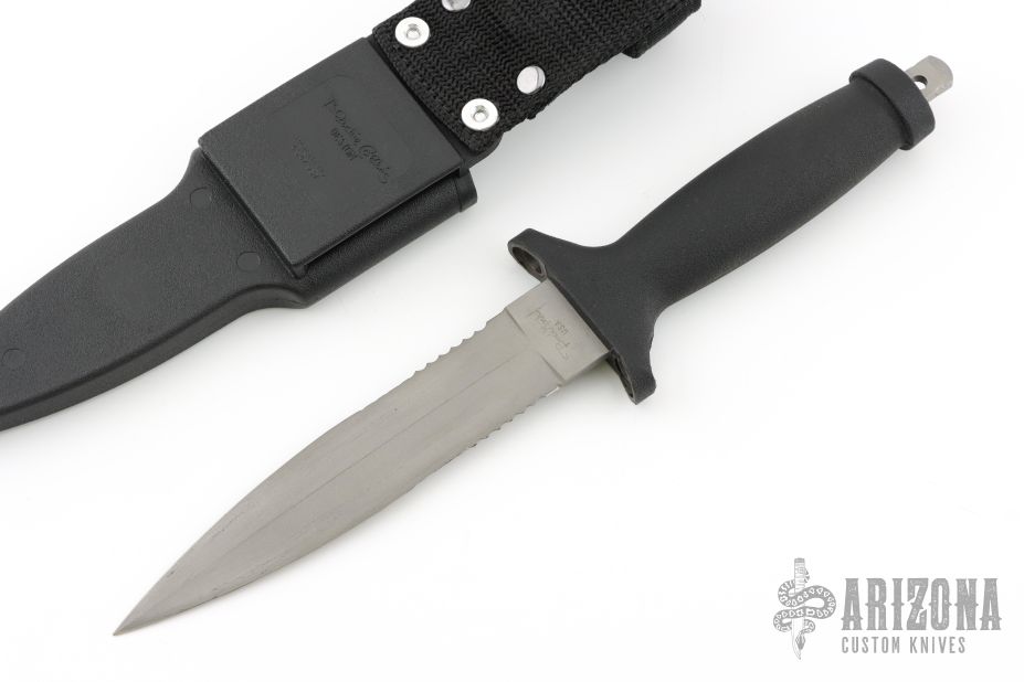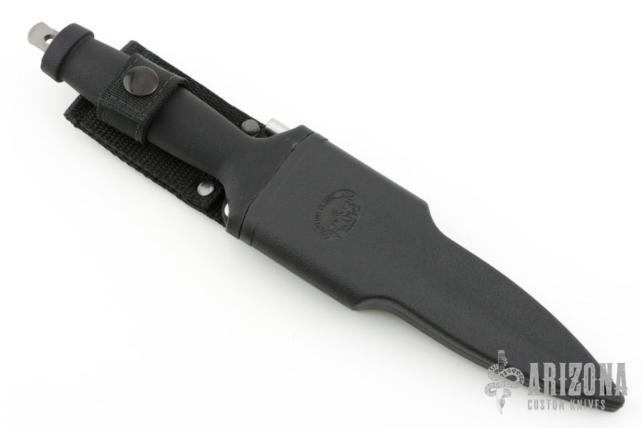 This is a Benchmark TAC II Military Survival Knife with the locking sheath. The bead blasted blade is double-edged and double serrated. Blade is .149" thick and 1.131" in depth. Blackie Collins is the designer. The handles on TAC IIs are molded Zytel, full-hidden-tang. Comes with original locking sheath. Has a couple light scuffs, the blade has been resharpened and a couple of the serrations were removed, otherwise good condition.