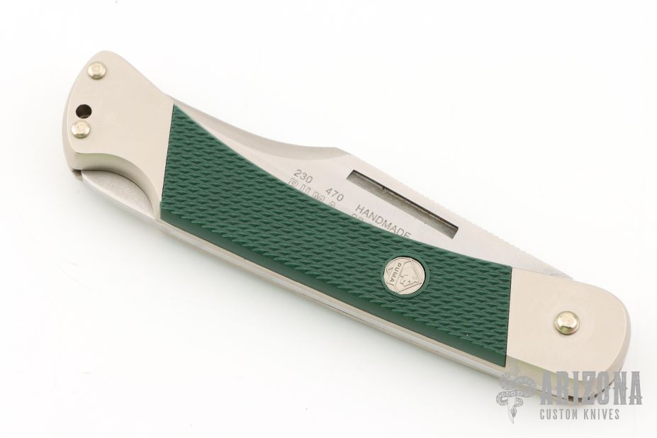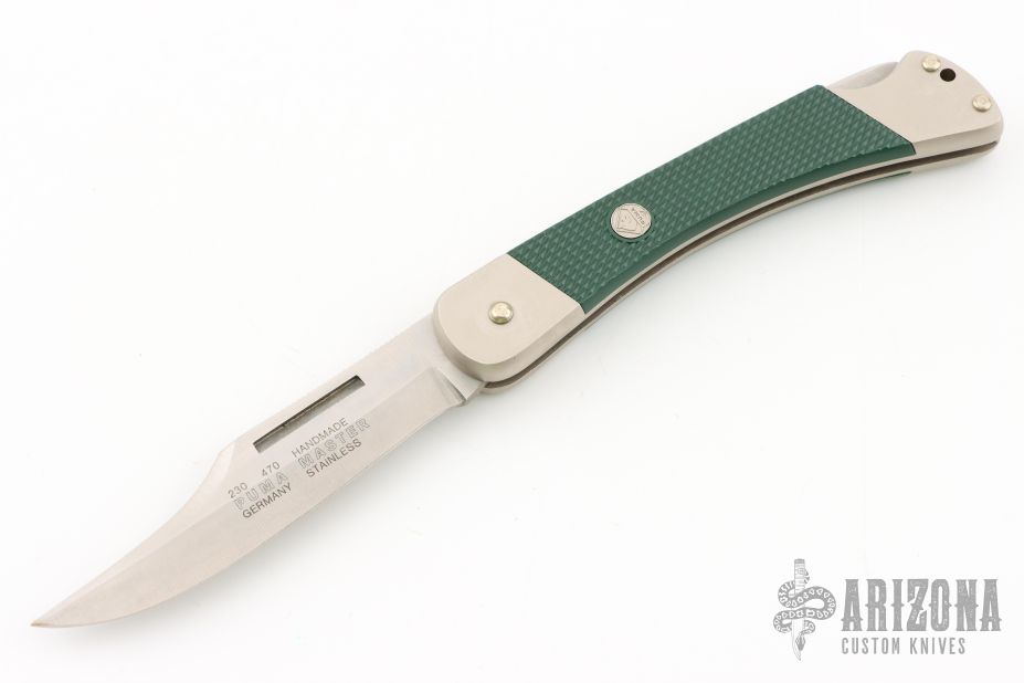 This 470 Puma Master by Puma Knives features a satin finished clip point blade with nail nick. They have nickel silver frame with green insets. Has a couple light scuffs, otherwise excellent condition.