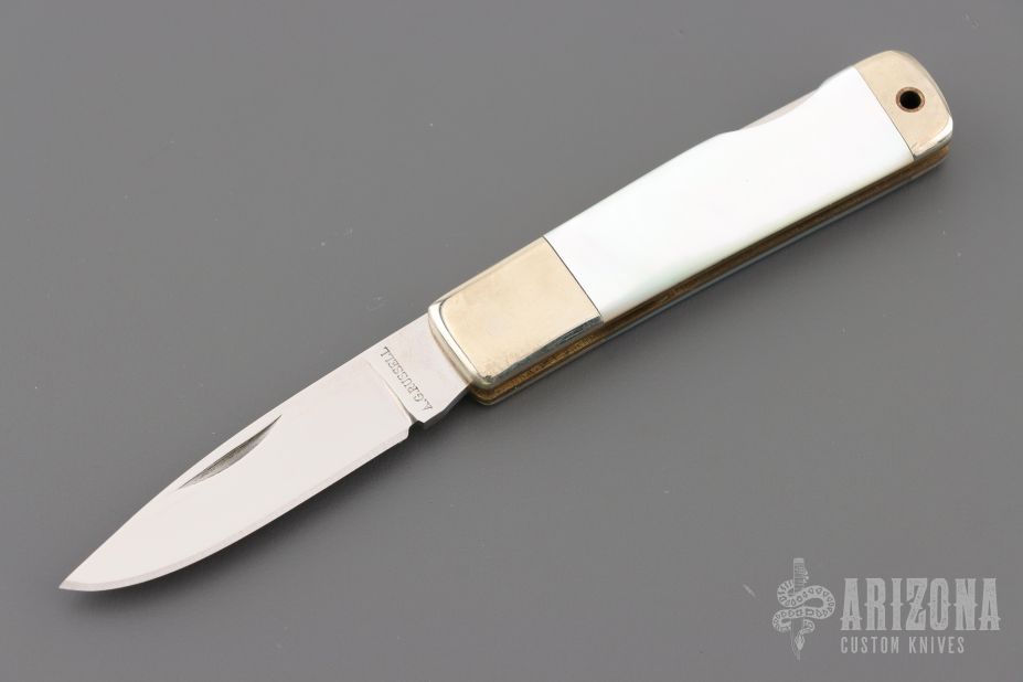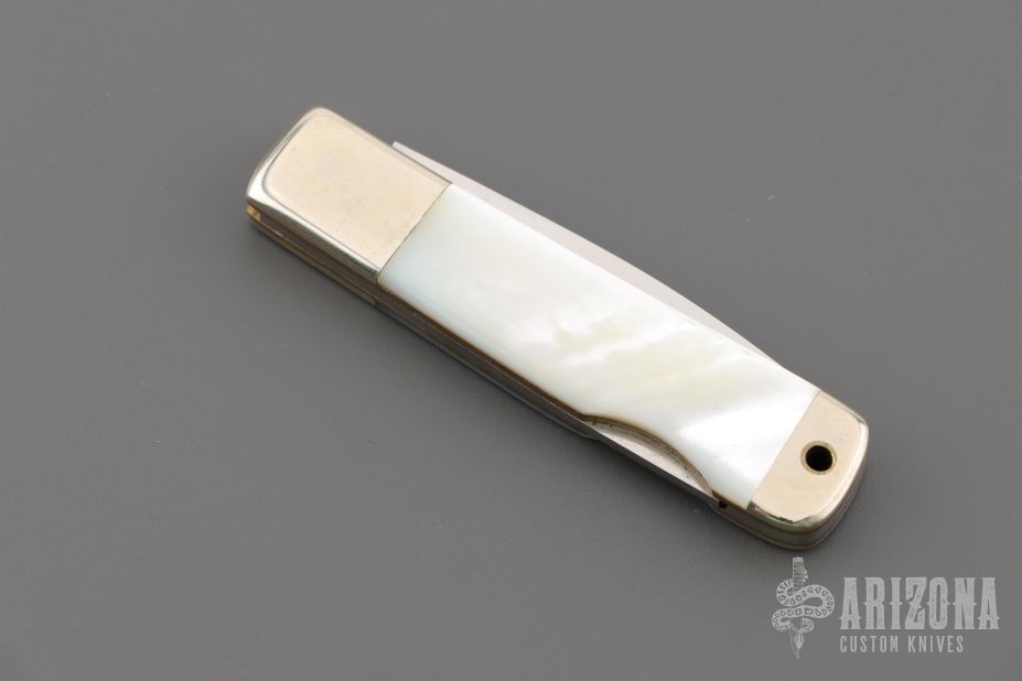 This Lockback by AG Russell features a mirror polished blade with nail nick. The handle has nickel silver bolsters, mother of pearl scales and brass liners. Includes the orignal box. Excellent Condition.