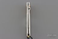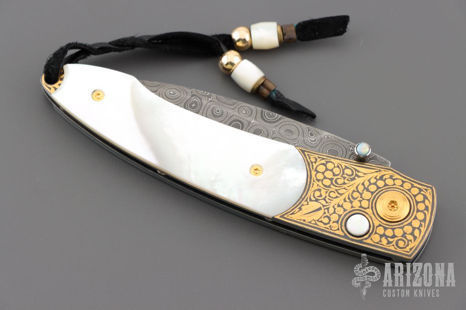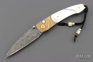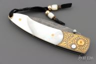 This button lock by William Henry features beautiful mother-of-pearl scales with 24k Gold Koftgari engraved stainless bolsters with integral liners.  This knife features a stainless Damascus drop point blade with a single thumbstud with an opal inlay.  Includes a original box and papers. Excellent condition.
