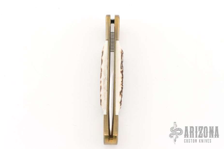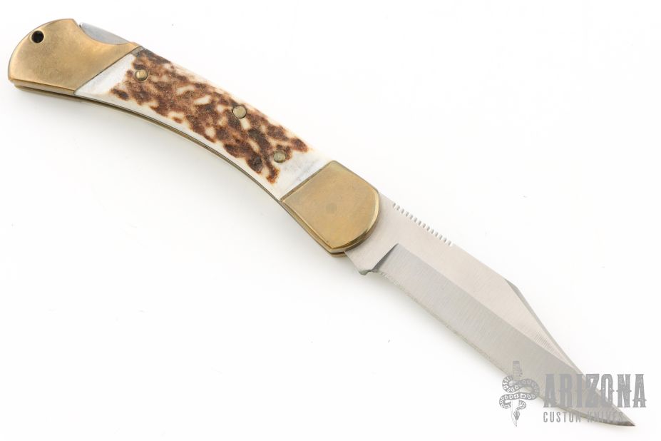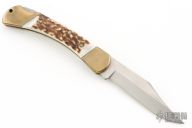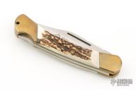 This Vintage German-made lockback by Puma has brass bolsters with integral liners. Very nice stag scales. Blade is satin finish. Comes with original box and Velcro case. Excellent condition.
