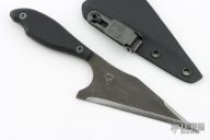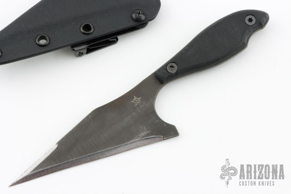 The Sparrow by JB Knife and Tool features a black blade with .115" blade stock and 1.787" blade depth, full tang construction. The handle has black G-10 scales. Comes with a kydex sheath. Has some light scuffs, otherwise excellent condition.