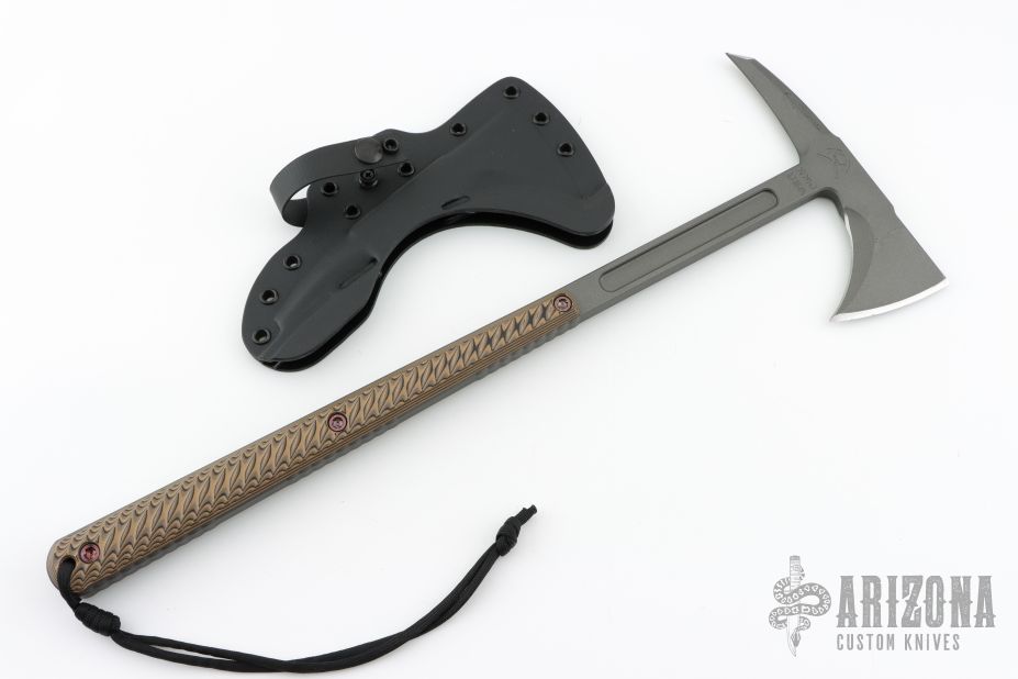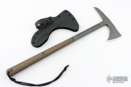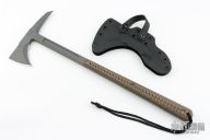The Eagle Talon is the tomahawk that started it all. It was the first all-steel integral designed tomahawk and has been the keystone for all other RMJ tomahawks. It was inspired by 18th Century French and Indian War tomahawks that our designer, Ryan, had been emulating for many years. In the Spring of 2001, Ryan was commissioned by members of the USAF 820th Security Forces to design a tomahawk that featured 18th century lines and 21st century engineering; a tomahawk for modern combat use. Work began, and by the fall of 2001 the Eagle Talon Special Forces Tomahawk was being used in Afghanistan. Why a Tactical Tomahawk? The tomahawk has served as an effective field tool and weapon for over 300 years, and the physics behind the tomahawk design give it many advantages over a knife. The user can choke up on the grip to use the tomahawk like a more traditional knife, or when held in a normal grip, the cutting power and strike force is multiplied several times over due to the leverage created by the length of the handle. Great for: Breach | Utility | Emergency / Safety Tool | Preparedness Kit Specifications Overall Length: 7 in Overall Height: 18 in Forward Cutting Edge Length: 2.875 in Blade Thickness: .400 in Weight: 1 pound 15 ounces (without sheath) Blade Material: 80CRV2 Carbon Steel (HRC 57-58) Sheath: Molded kydex sheath and Low-Ride M.O.C. straps